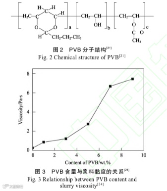 唐国伟等研究了PVB对陶瓷流延生坯密度、力学性能、微观结构及其烧结性能的影响,表明PVB分子量是主要的影响因素。Feng等使用PVB作为粘结剂,对浆液的流变行为进行了表征。浆料的粘度随转 速的增加而降低,表现出典型的剪切变稀行为。