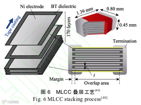 干燥完成后,需要在规定的区域内,按x方向和y方向冲压或裁剪所需形状。冲压可制成简单的正方形或长方形孔,而裁剪可以制成各种各样的其他形状,将裁剪后的薄片进行叠层。例如:多层陶瓷电容器就是几层薄片叠层烧结形成的单个坚固陶瓷体,如图6所示。叠层中必须控制的基本参数有温度、压力和时间,温度的选择 主要考虑加入有机添加剂后的玻璃转化温度,以及产品叠层厚度和数量,保证所有陶瓷薄片受热均匀。压力的选择主要考虑层与层之间紧密接触达到成型要求,且压力不会使陶瓷薄片变形影响最终尺寸。