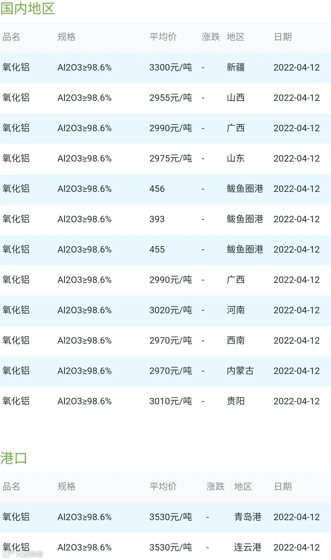 CERADIR先进陶瓷在线2022年04月12日氧化铝粉体材料市场参考价: