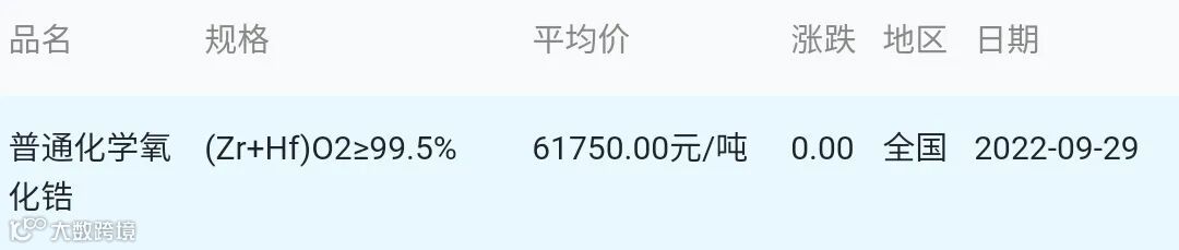 2022年09月29日氧化锆材料市场参考价: