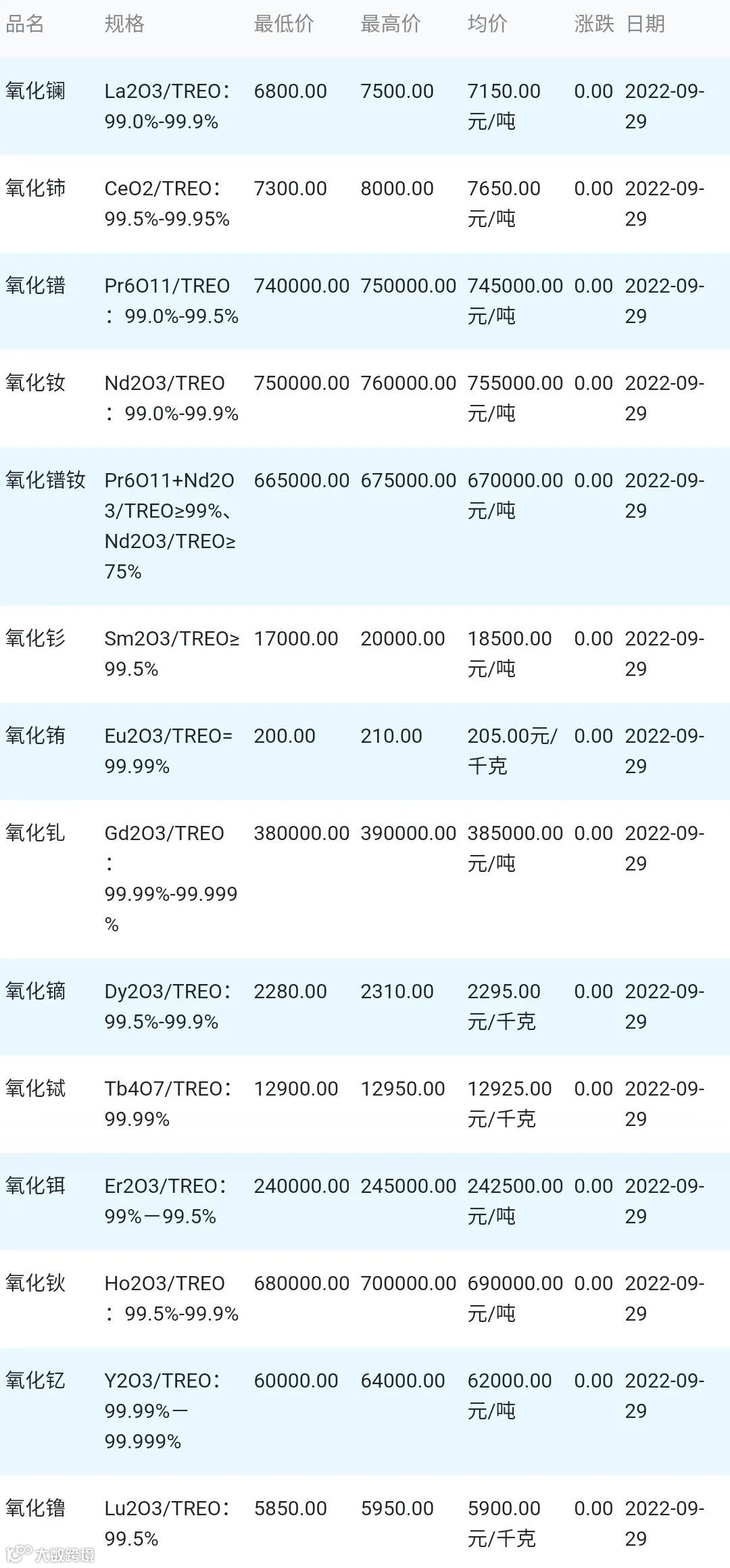 2022年09月29日稀土氧化物材料市场参考价: