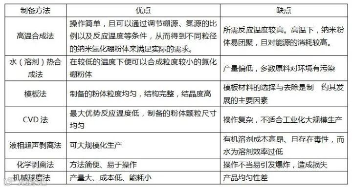 目前纳米氮化硼粉体的制备方法有很多,根据其原理大致可以分为两大类:其中一类是合成法,主要有高温合成法、溶剂热合成法、模板法和化学气相沉积法(CVD)等;而另一类是剥离法,包括液相超声剥离法、激光蚀刻剥离法、机械球磨法等。