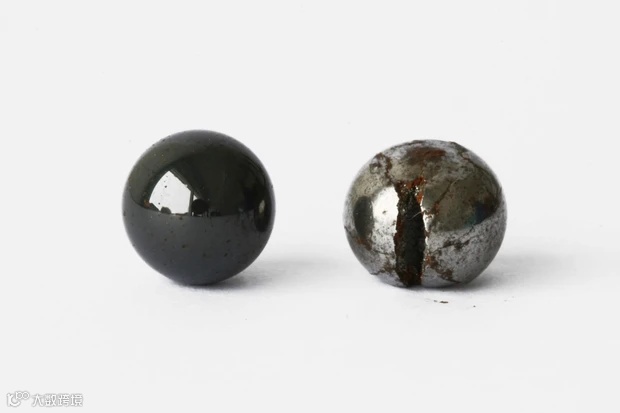 在陶瓷轴承与钢轴承的压力测试中,相同的压力下钢球破裂,但陶瓷球完好无损。