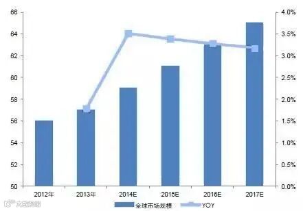 2012-2017全球陶瓷封装基座市场规模及增速预测(亿元)