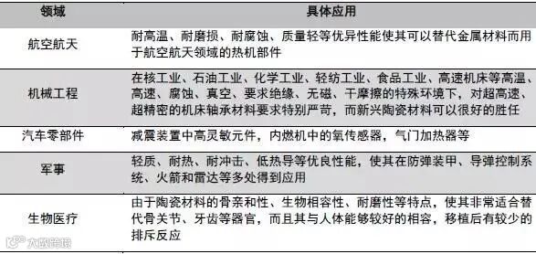 由于新型电子陶瓷材料具有各种优良的物理和化学特性,使其在航空航天、机械工程、汽车零部件、军亊、生物医疗等领域也得到了广泛应用。