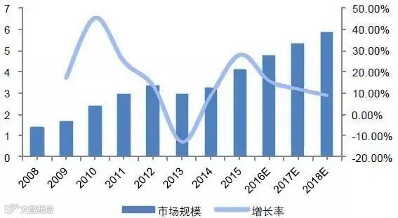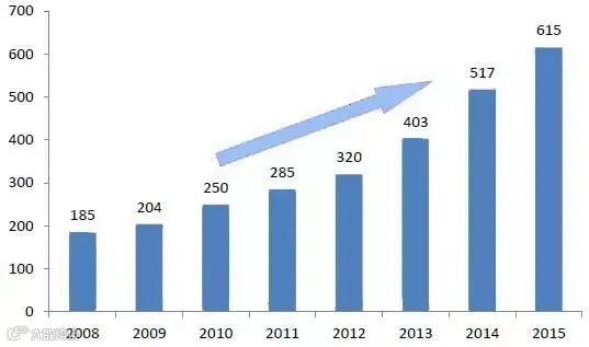 我国LED封装市场总量巨大,2008年我国LED封装市场规模约为185亿元,到2015年,我国LED封装市场规模就已经成长到615亿元,并且将持续增长。
