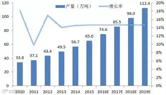 我国电子陶瓷元器件的生产也在快速发展。据统计,2009年我国电子陶瓷产量为28.6万吨,2014年行业产量增长至56.7万吨,5年时间几乎翻了一番,近年来行业产量年均增速接近15%。