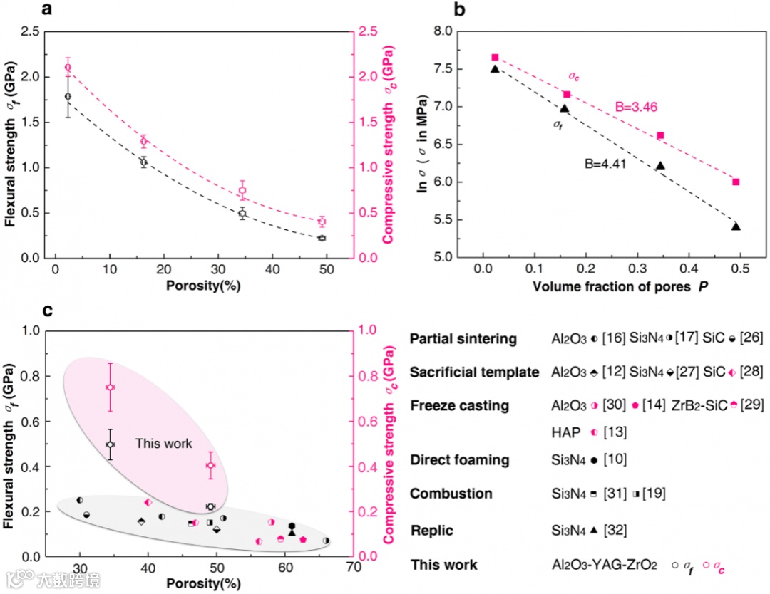 多孔共晶复合陶瓷抗弯/压缩强度和孔隙率的关系;(b)抗弯/压缩强度和孔隙体积分数的关系均满足经典经验公式,并计算得到了对应的B值;(c)本工作得到的结果与目前报道的多种方法制备的各种多孔陶瓷强度之间的对比分析