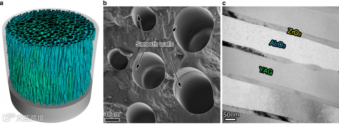 (a)利用CT成像揭示的多孔陶瓷内部气孔的三维结构特征;(b)光滑连续的曲面孔壁;(c)多孔骨架基体的纳米三元共晶层片结构