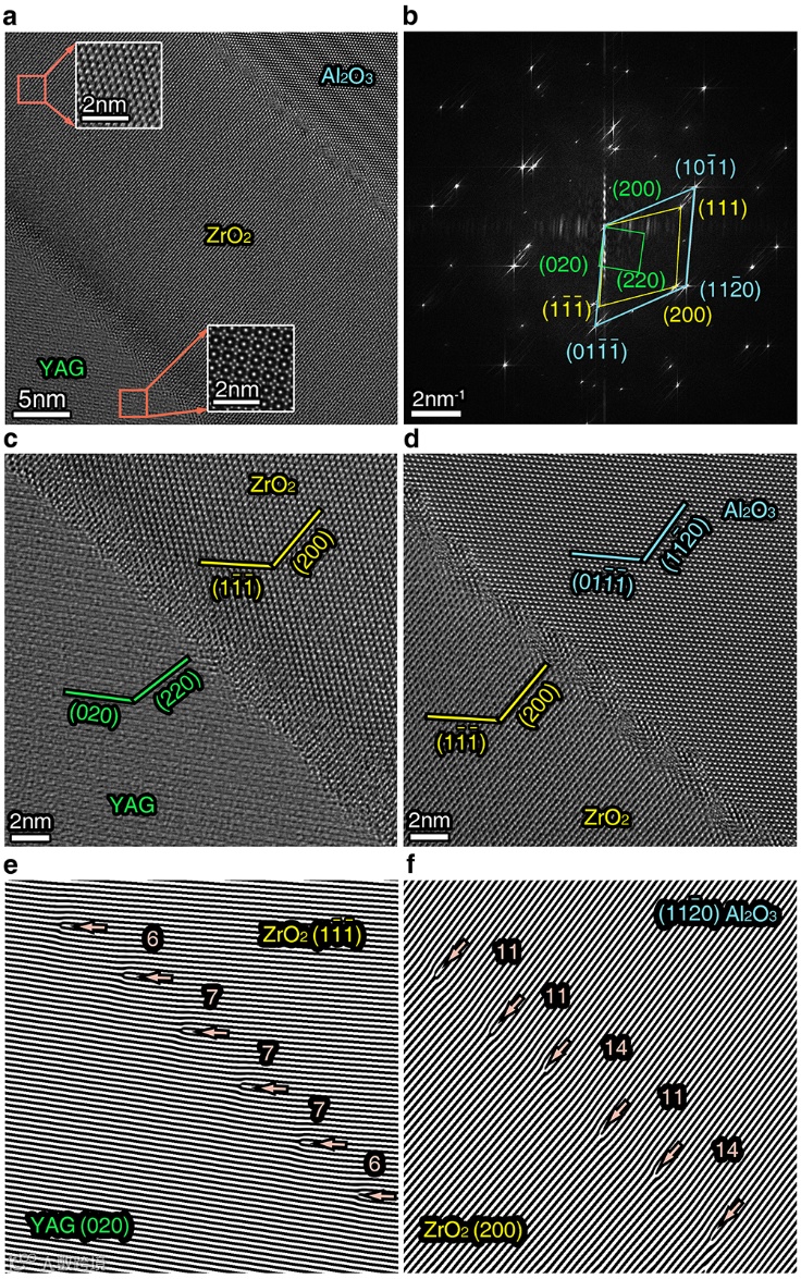界面的高分辨透射电镜图片;(e-f) YAG/ZrO