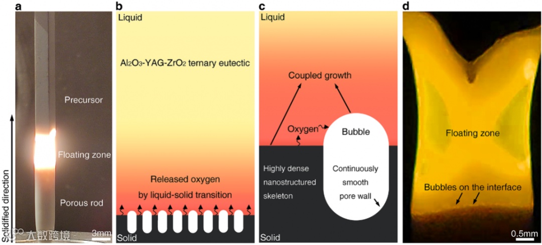 多孔共晶复合陶瓷的示意图;(b)原位孔隙形成机制示意图;(c)液固界面处固相和气泡之间的耦合生长过程;(d)定向凝固过程中液固界面上实时观察到的稳定生长的气泡