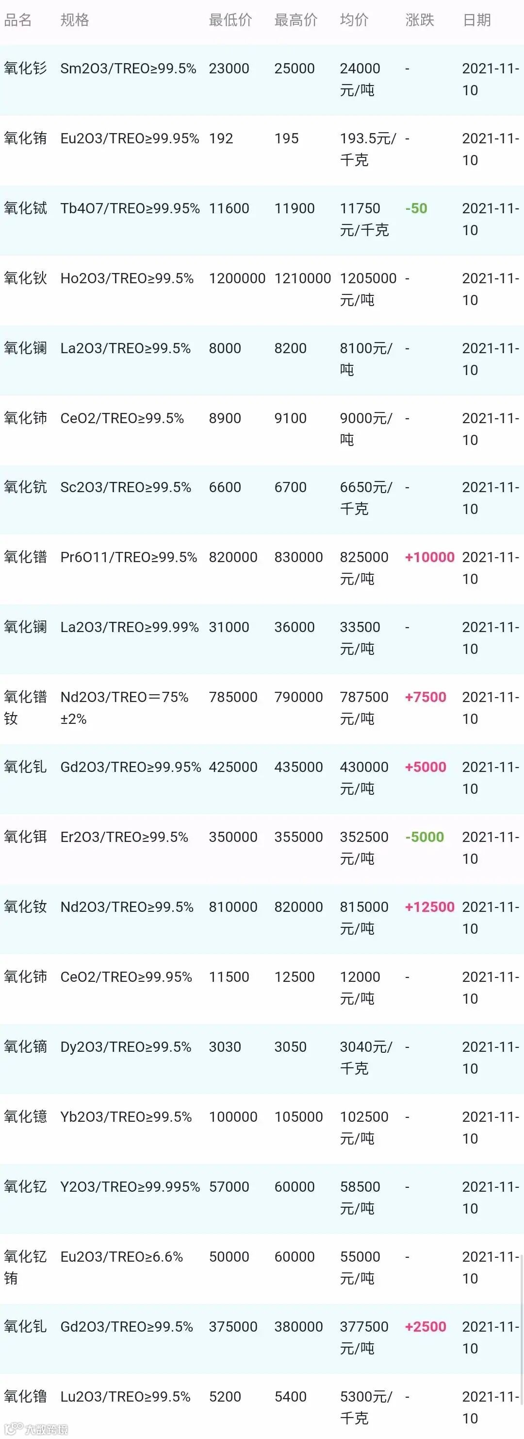 2021年11月10日稀土氧化物材料市场参考价: