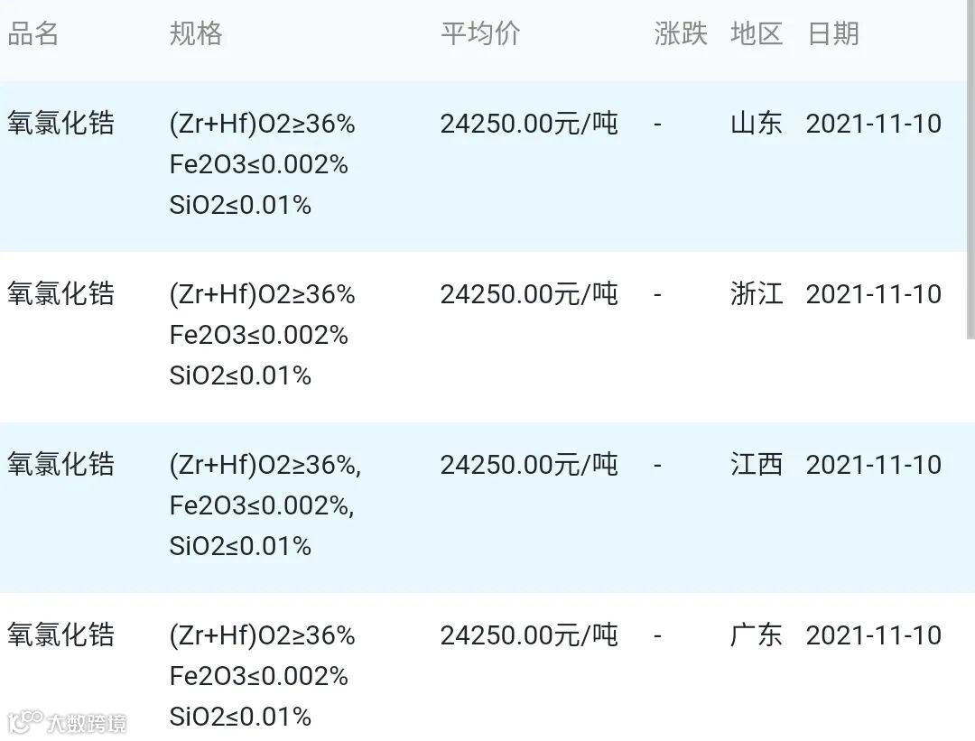 2021年11月10日氧氯化锆材料市场参考价: