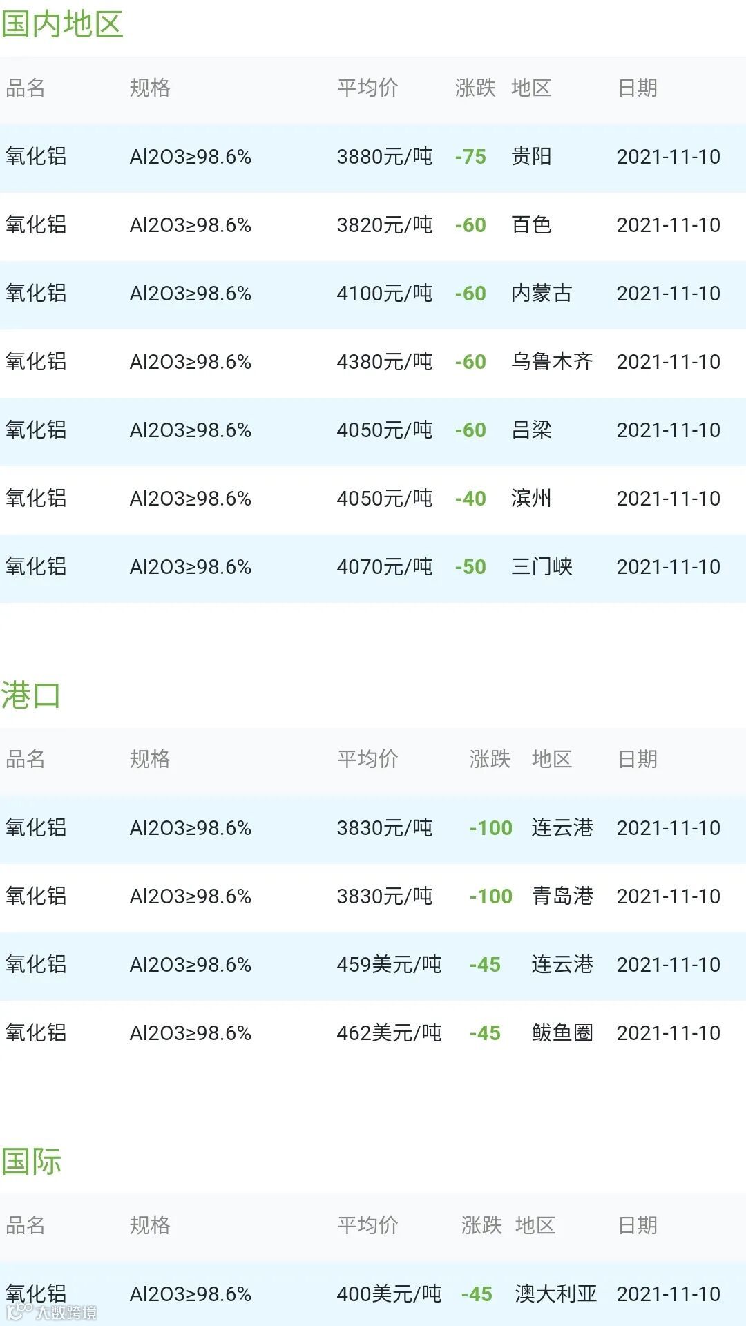 CERADIR先进陶瓷在线2021年11月10日氧化铝粉体材料市场参考价: