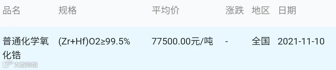 2021年11月10日氧化锆材料市场参考价: