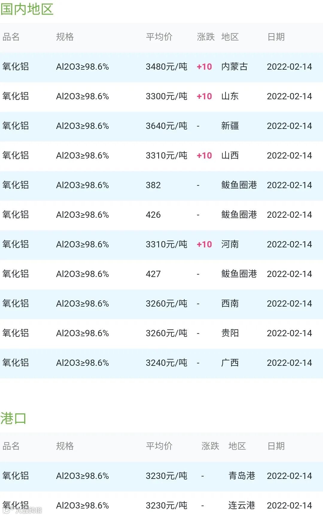 CERADIR先进陶瓷在线2022年02月14日氧化铝粉体材料市场参考价: