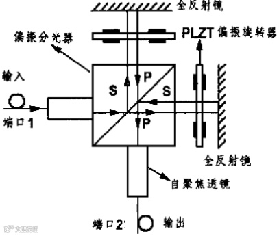 利用PLZT陶瓷的电控可变光散效应,可以开发出一系列具有不同性能的光开关器件,如新型偏振无关光开光、宽谱严格无阻塞PLZT空分矩阵光开光、全波段亚微秒级响应的单片PLZT4门集成尾纤封装开关等。利用PLZT材料制成的光开关具有良好的开关性能和巨大的带宽特性。图2所示为一种新型偏振无关PLZT光开关。这种光开关适合多模与单模光纤系统使用。