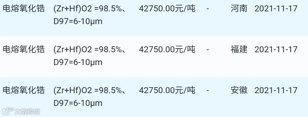 2021年11月17日氧化锆材料市场参考价: