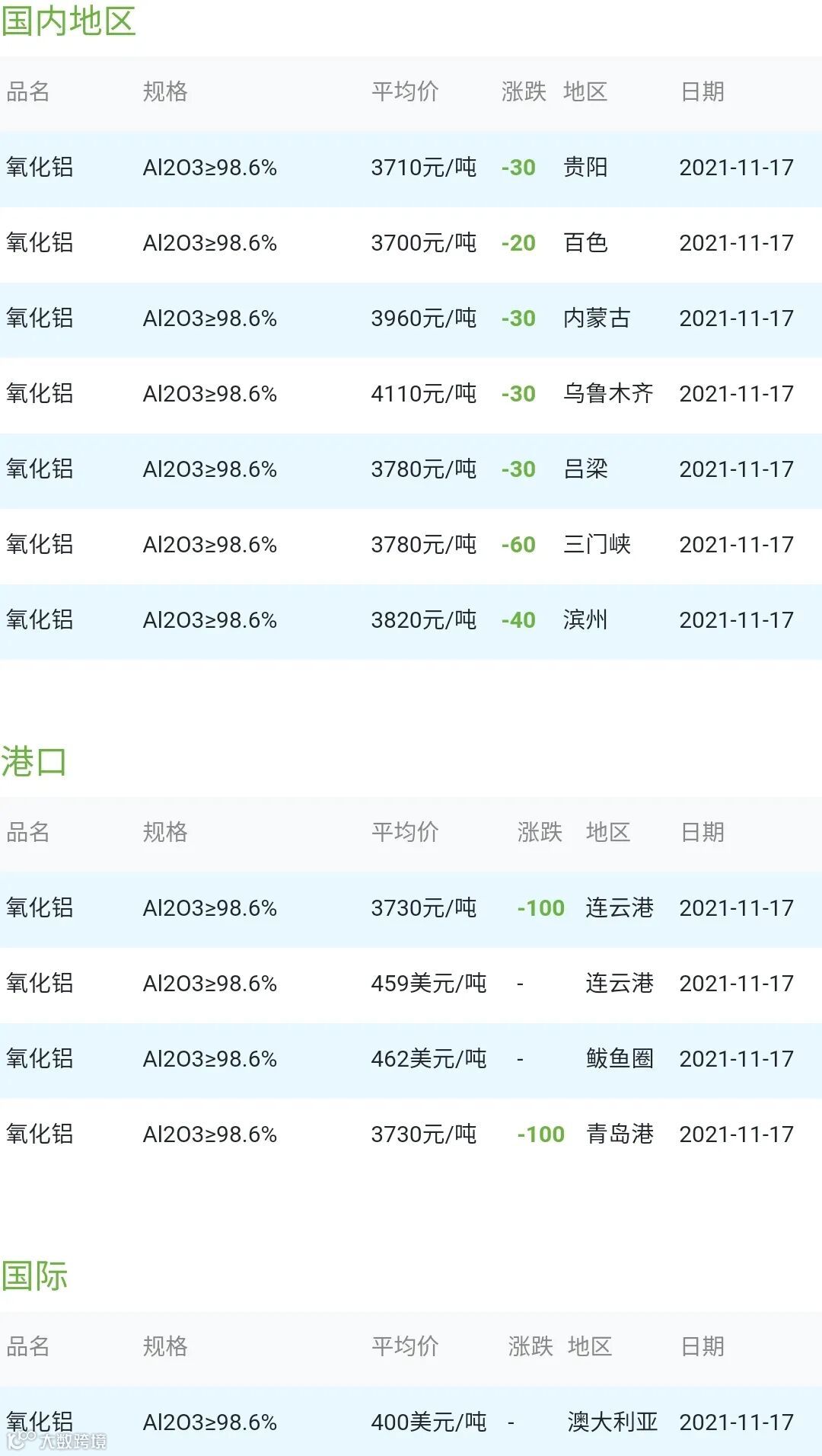 CERADIR先进陶瓷在线2021年11月17日氧化铝粉体材料市场参考价: