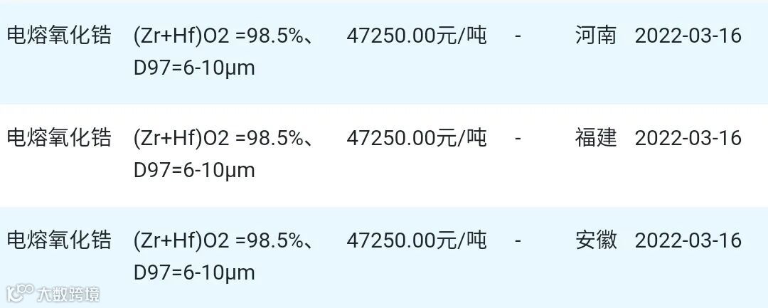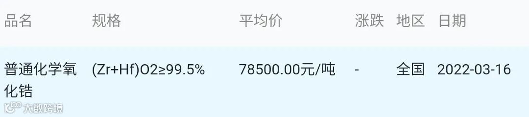 2022年03月16日氧化锆材料市场参考价: