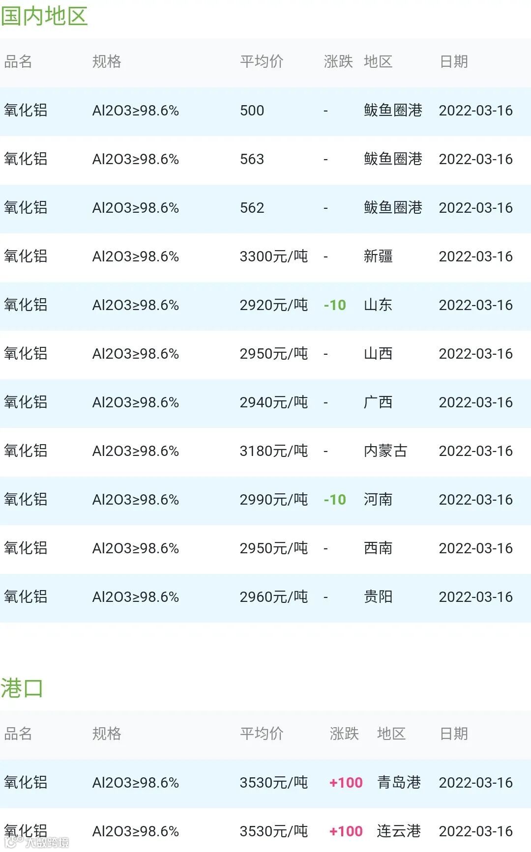 CERADIR先进陶瓷在线2022年03月16日氧化铝粉体材料市场参考价: