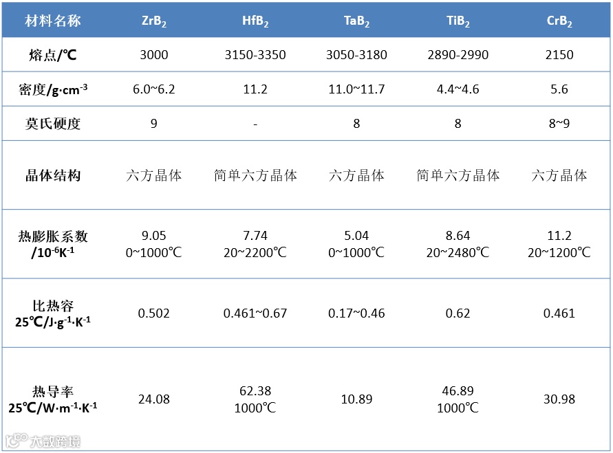 硼化物陶瓷是间隙相化合物,B与B之间可能形成多种复杂的共价键,同时,硼又与许多金属原子可以形成离子键。大部分硼化物中包含M-M金属键、B-B共价键、B-M离子键,硼化物的这些特点决定了它具有高熔点、高硬度、高耐磨性、和高抗腐蚀性。在硼化物陶瓷材料中,ZrB2、TiB2、CrB2等二元硼化物因其性能优异而被认为是最有希望得到广泛应用的硼化物陶瓷,均为六方晶系的准金属结构化合物,其中ZrB2和TiB2陶瓷具有相似的结构。