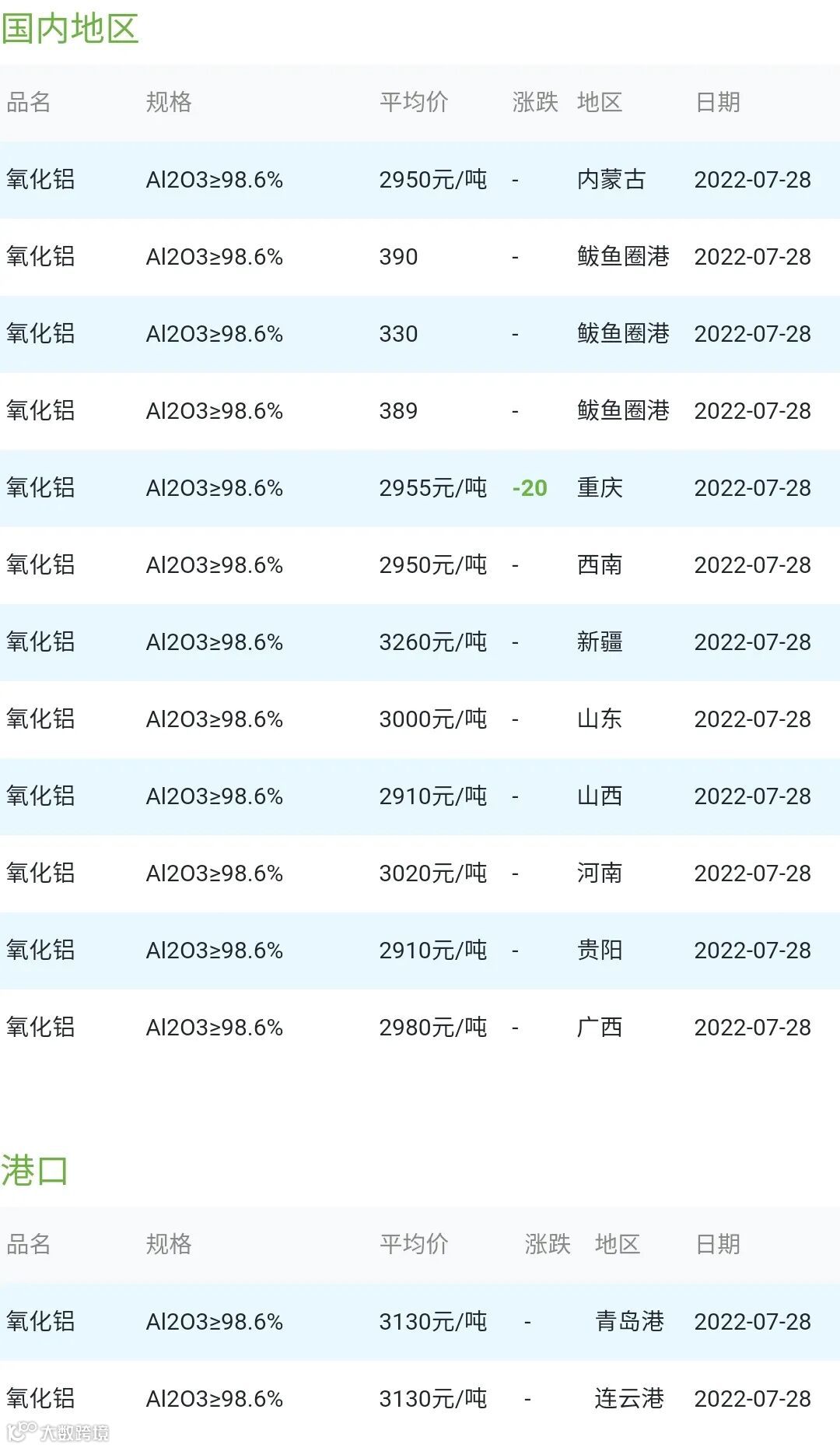 CERADIR先进陶瓷在线2022年07月28日氧化铝粉体材料市场参考价: