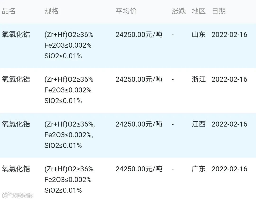 2022年02月16日氧氯化锆材料市场参考价:
