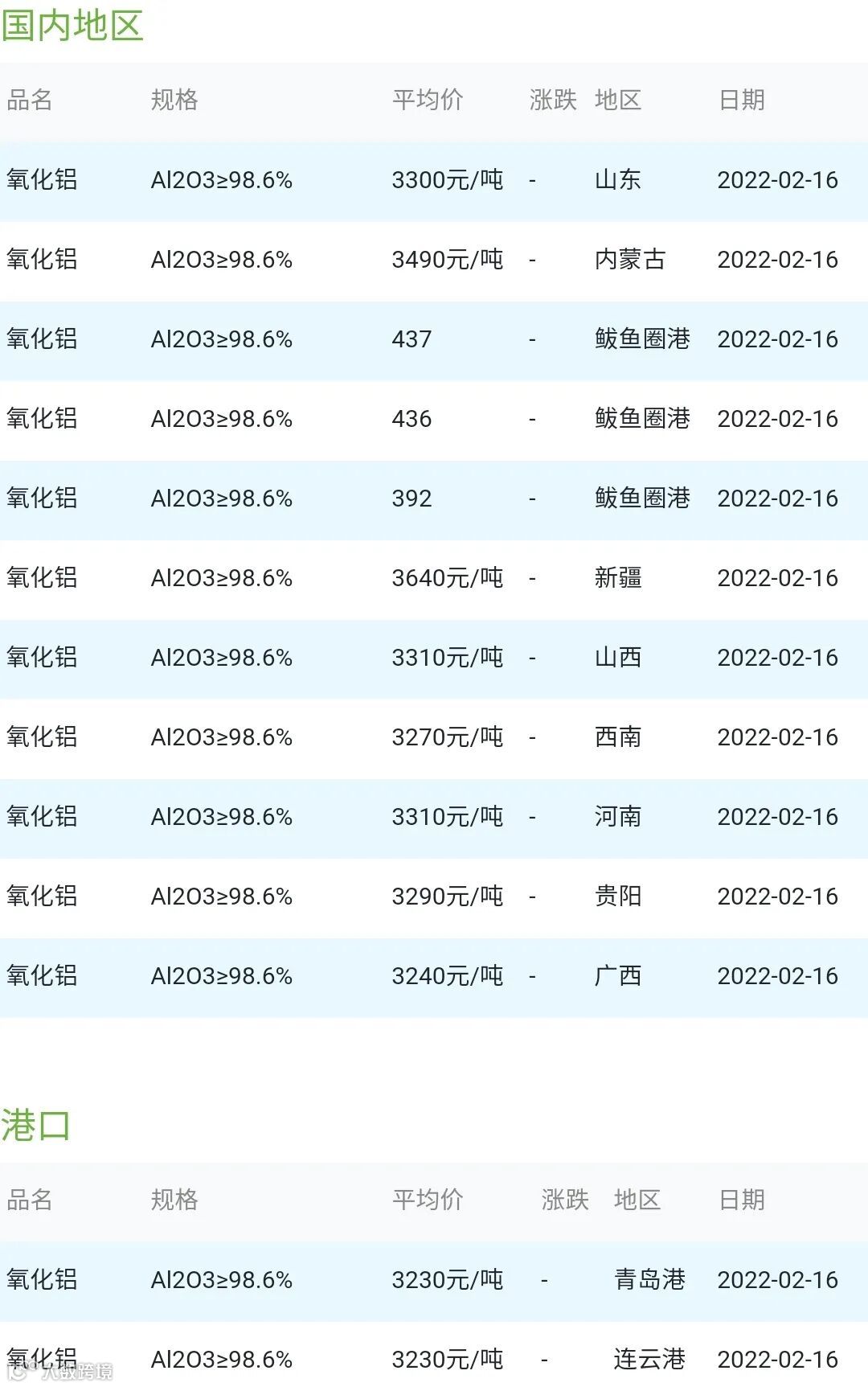 CERADIR先进陶瓷在线2022年02月16日氧化铝粉体材料市场参考价: