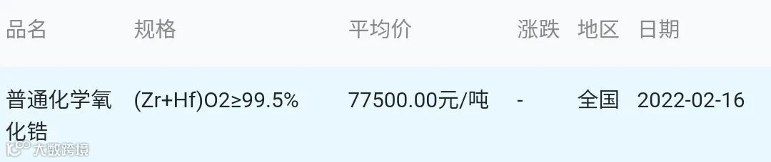 2022年02月16日氧化锆材料市场参考价: