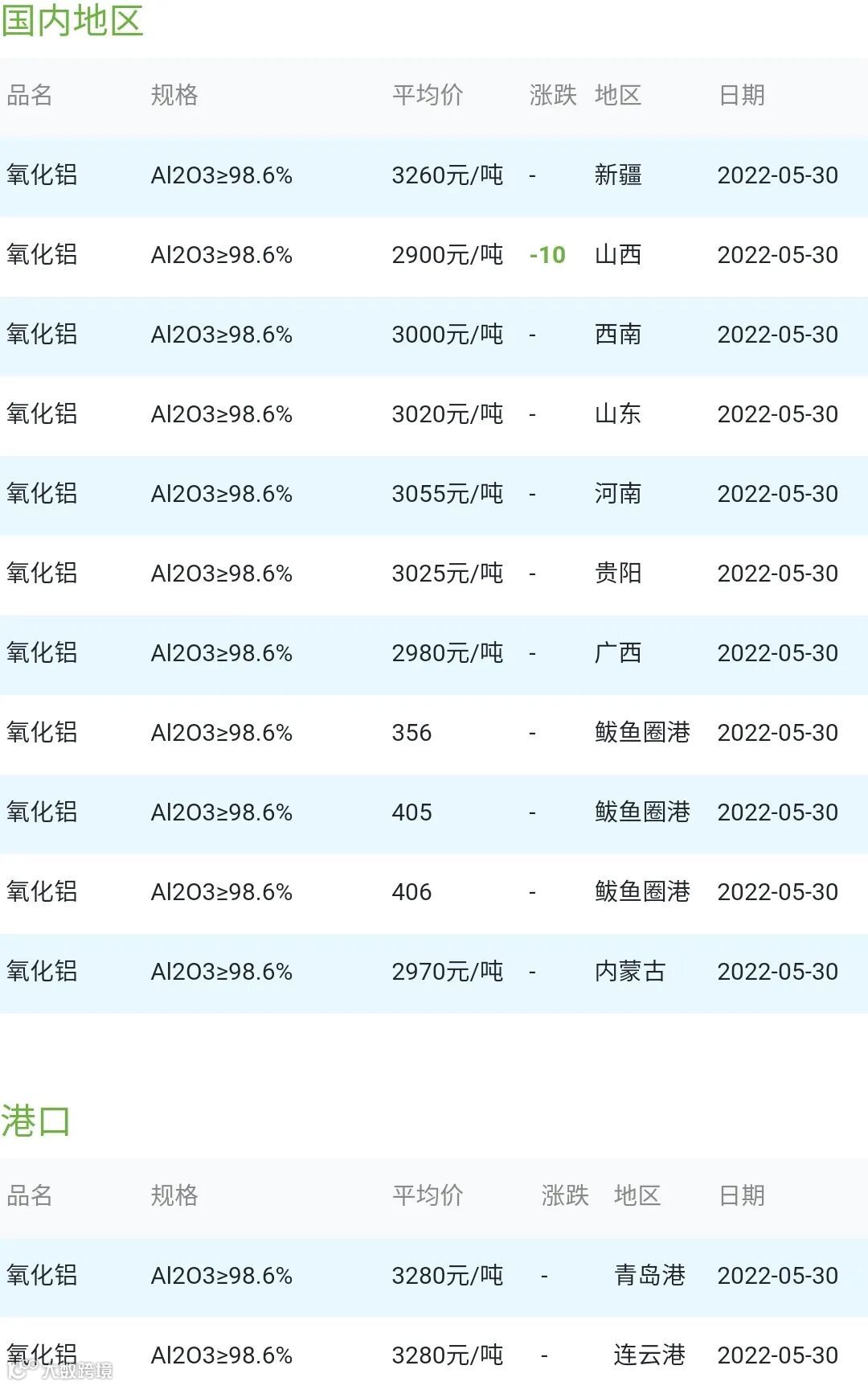 2022年05月30日氧化铝粉体材料市场参考价: