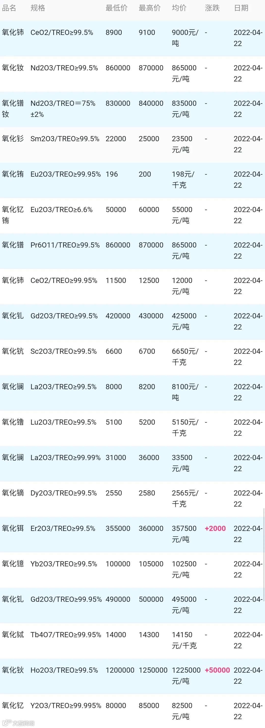 CERADIR:04月22日原材料&稀土氧化物参考价