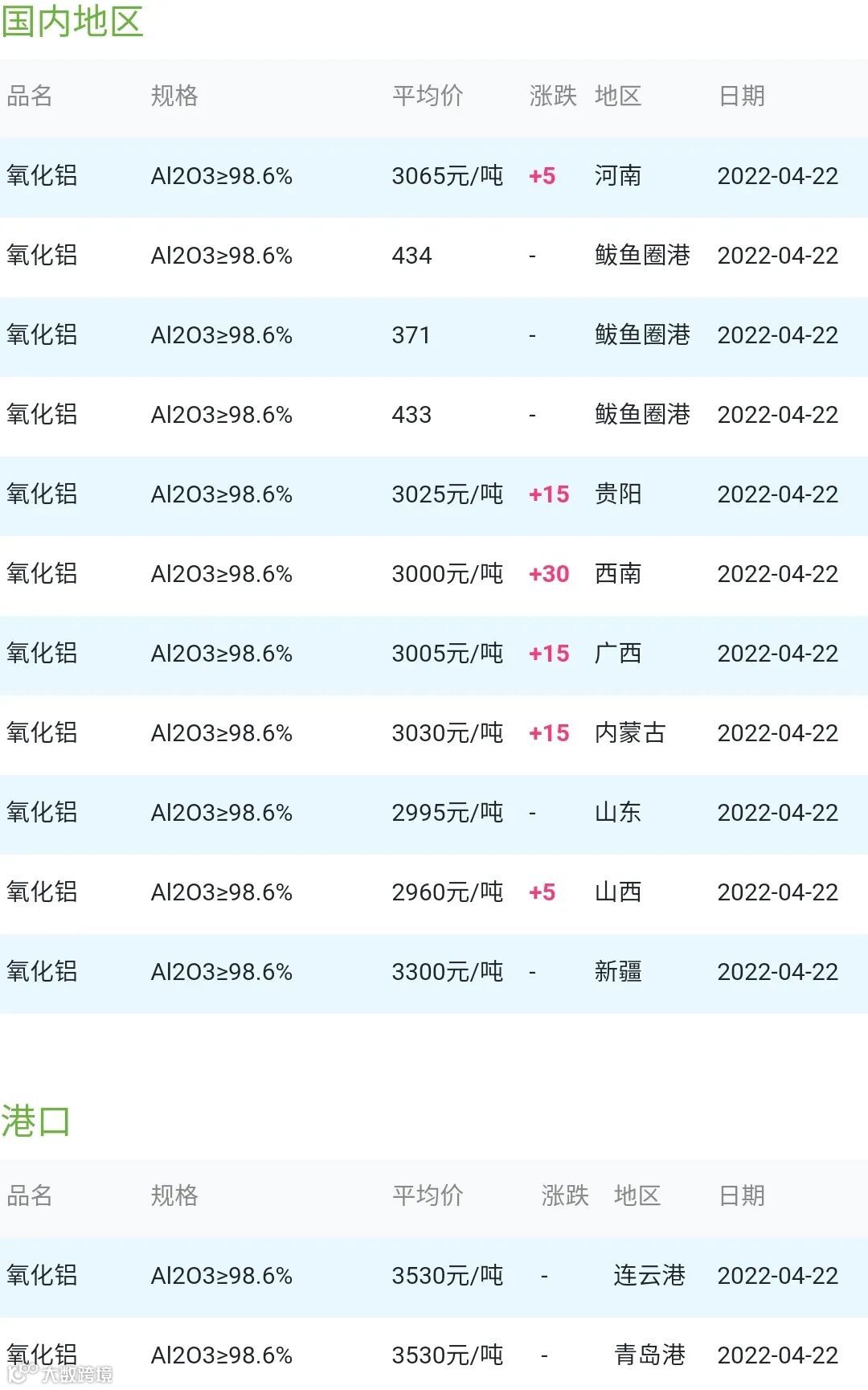 2022年04月22日氧化铝粉体材料市场参考价: