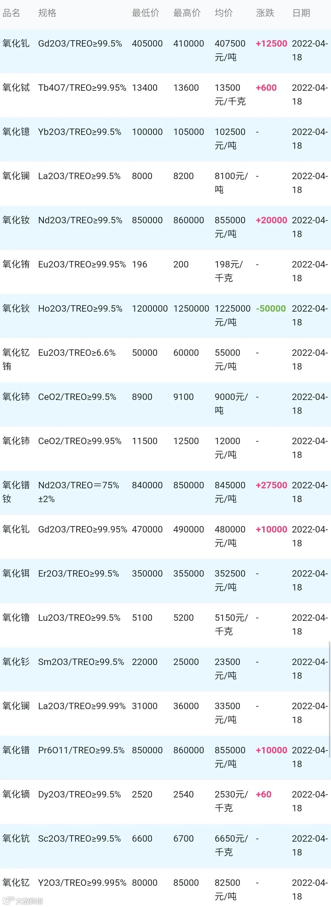 2022年04月18日稀土氧化物材料市场参考价: