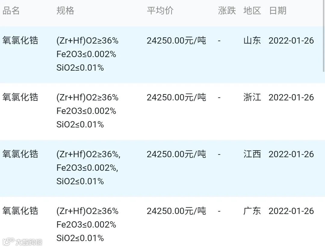 2022年01月26日氧氯化锆材料市场参考价:
