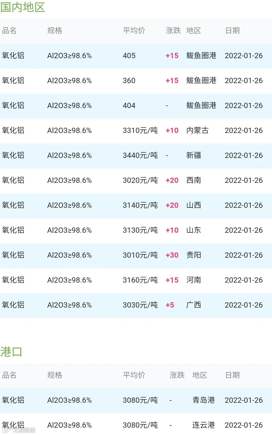 CERADIR先进陶瓷在线2022年01月26日氧化铝粉体材料市场参考价: