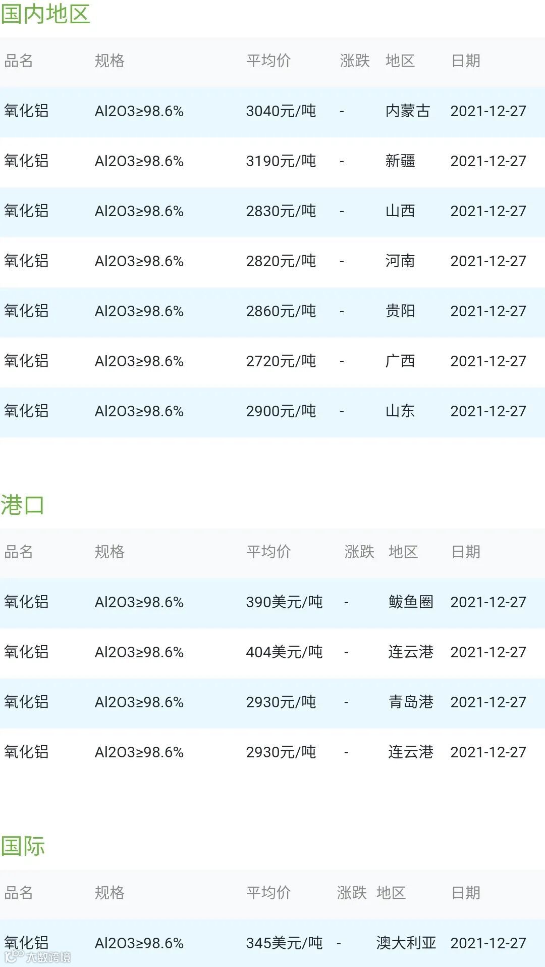 CERADIR先进陶瓷在线2021年12月27日氧化铝粉体材料市场参考价: