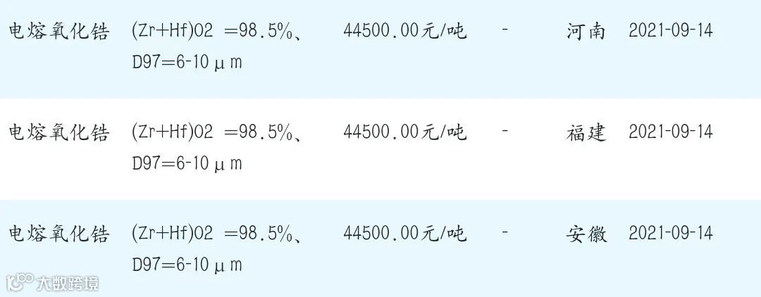 2021年9月14日氧化锆材料市场参考价:
