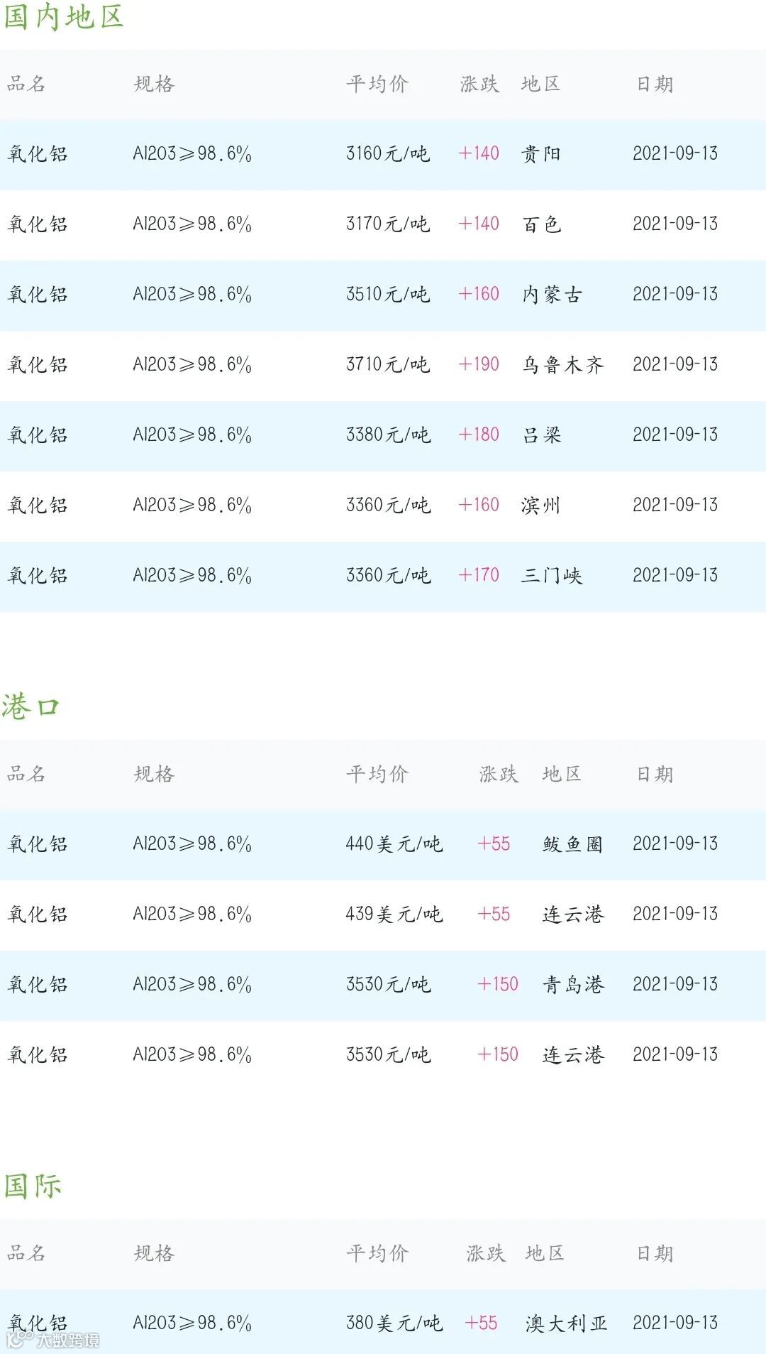 2021年9月13日氧化铝粉体材料市场参考价: