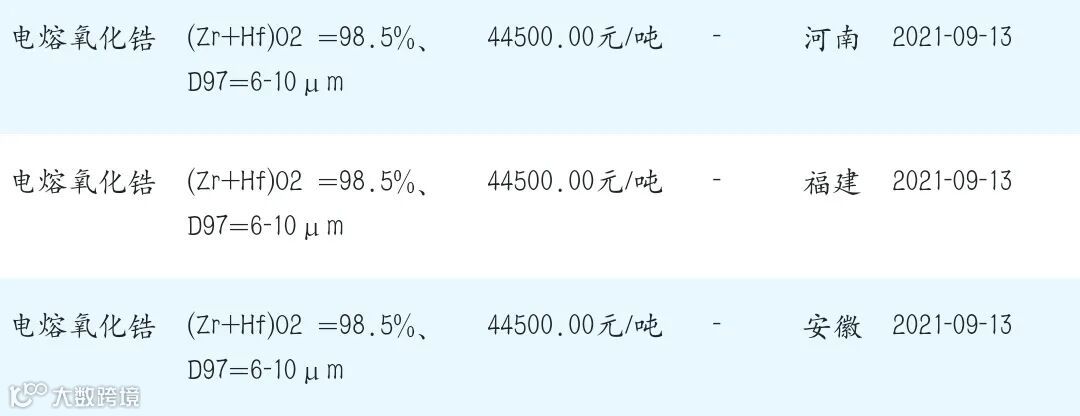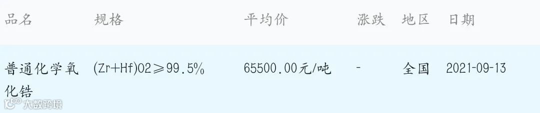 2021年9月13日氧化锆材料市场参考价:
