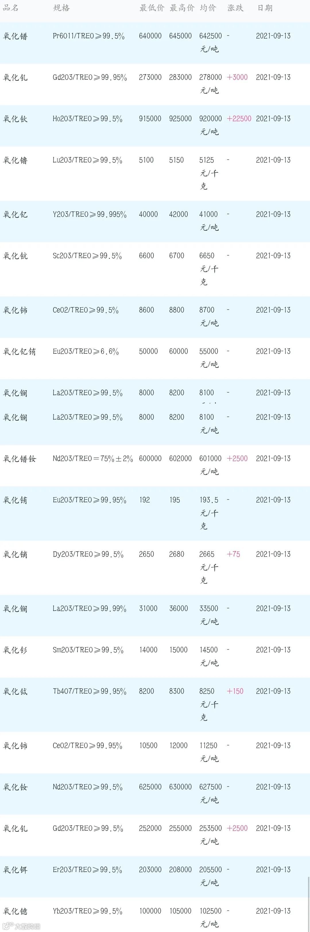 2021年9月13日稀土原料市场参考价: