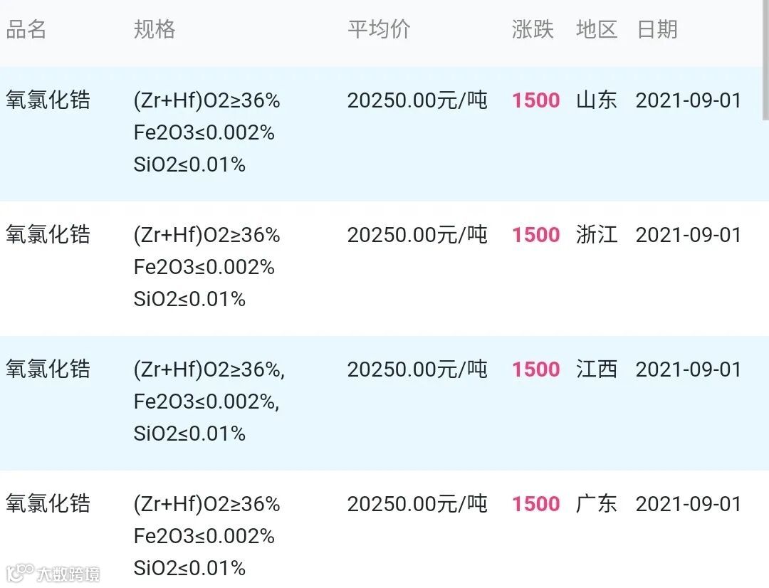 2021年9月1日氧氯化锆材料市场参考价: