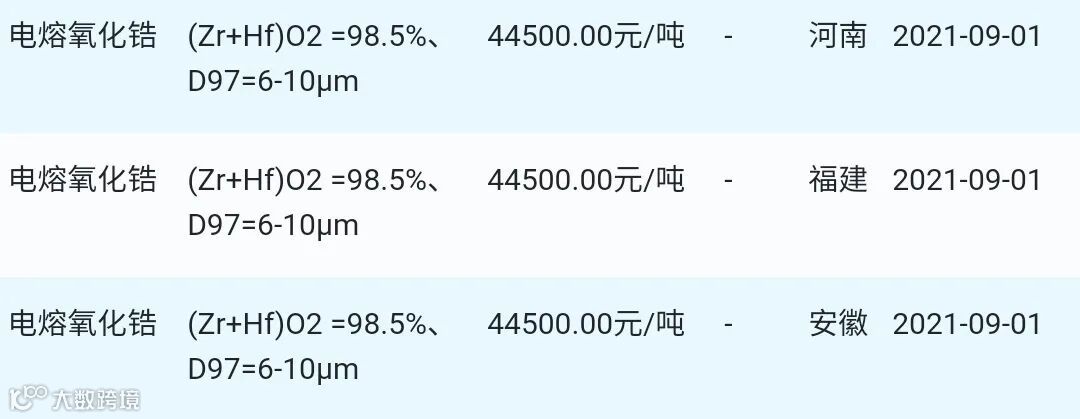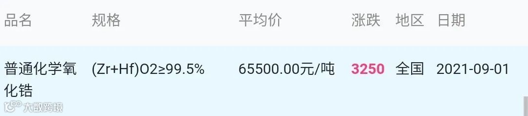 2021年9月1日氧化锆材料市场参考价: