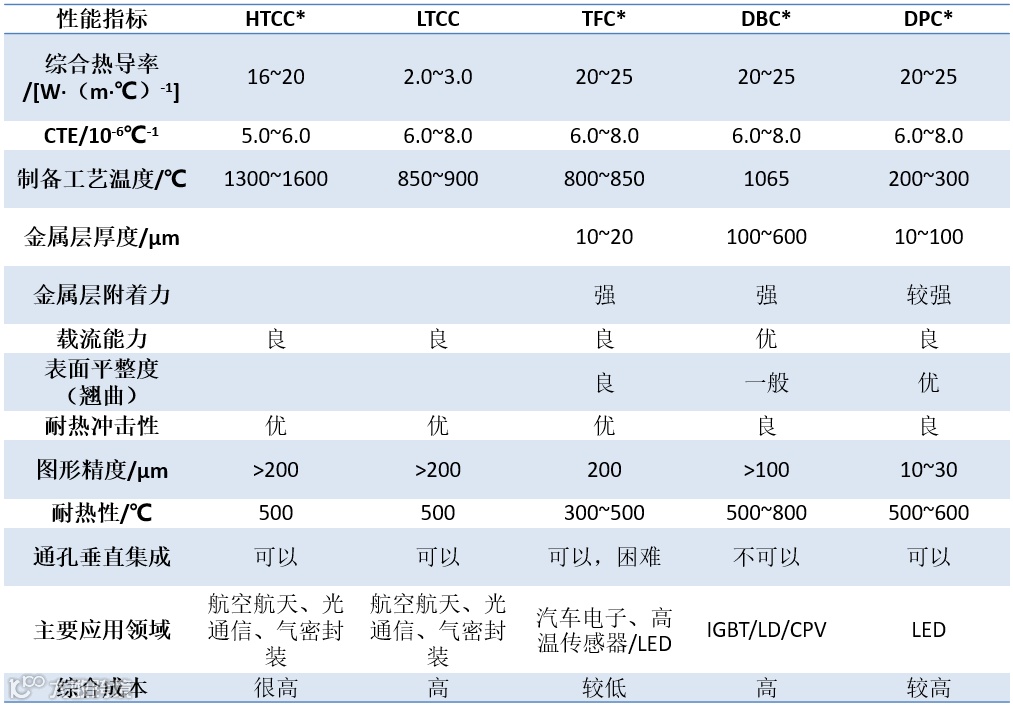 表2 几种常见陶瓷基板性能对比