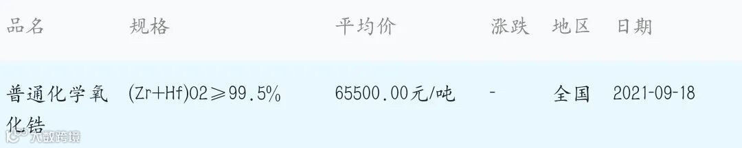 2021年9月18日氧化锆材料市场参考价: