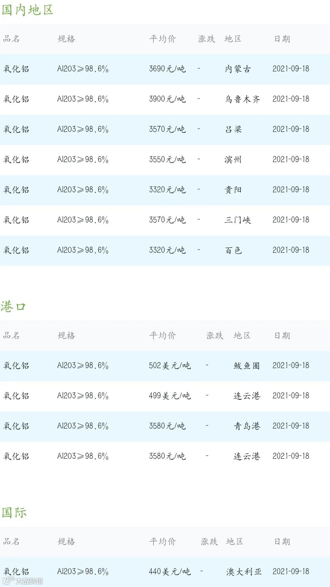 2021年9月18日氧化铝粉体材料市场参考价: