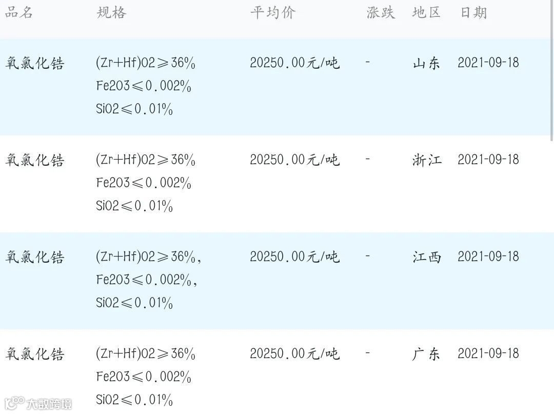 2021年9月18日氧氯化锆材料市场参考价: