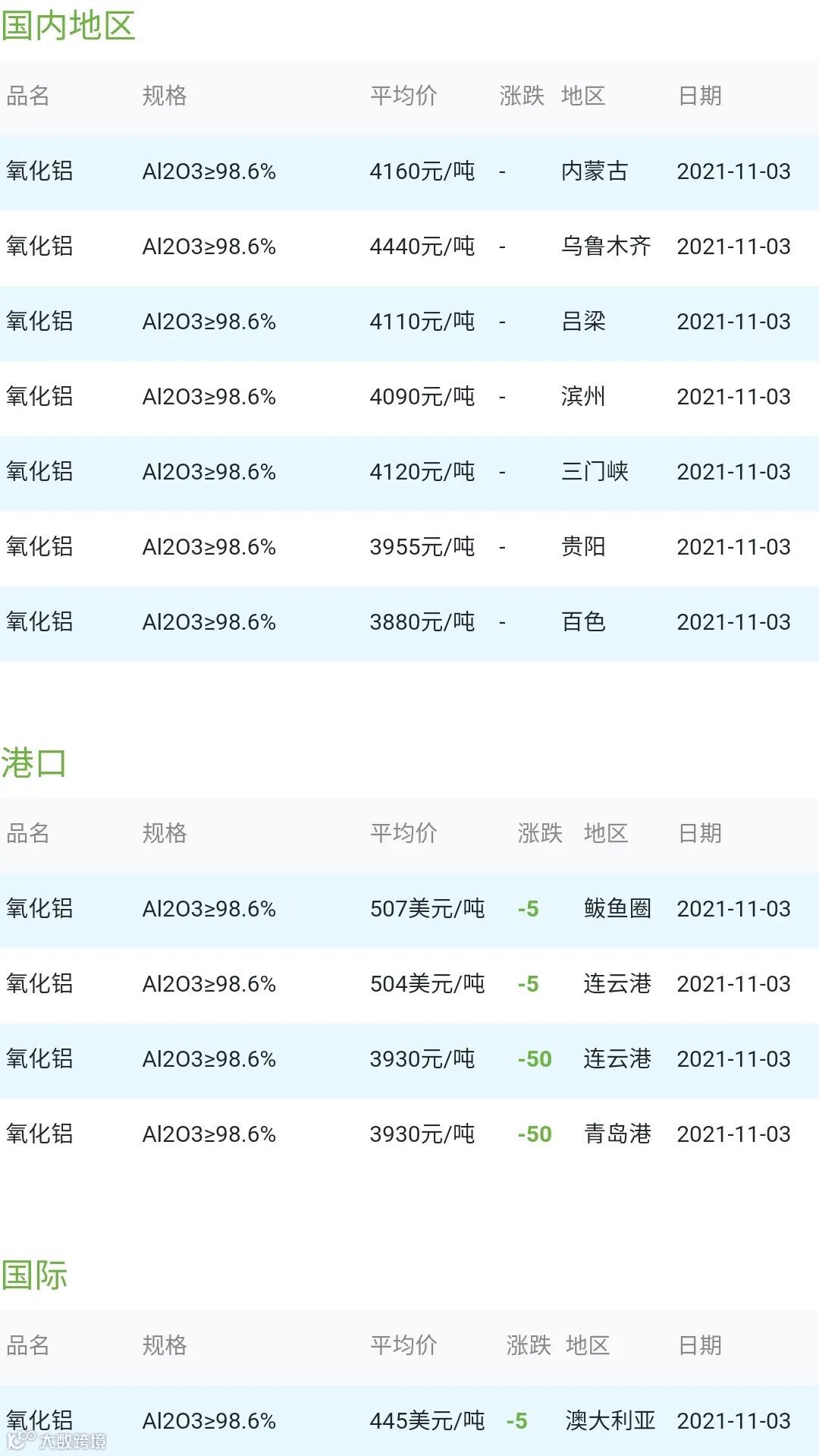 CERADIR先进陶瓷在线2021年11月03日氧化铝粉体材料市场参考价:
