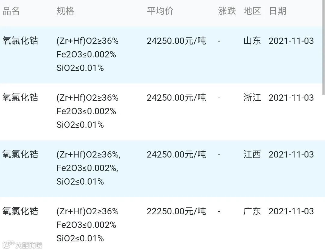 2021年11月03日氧氯化锆材料市场参考价: