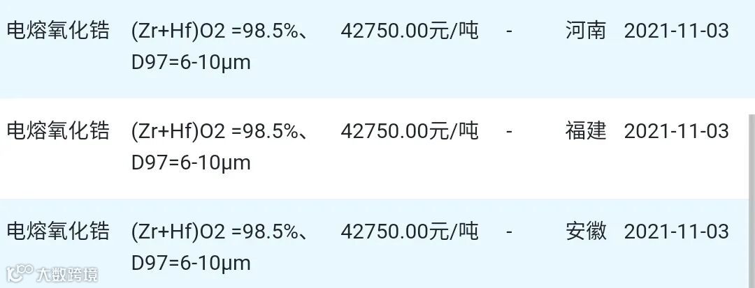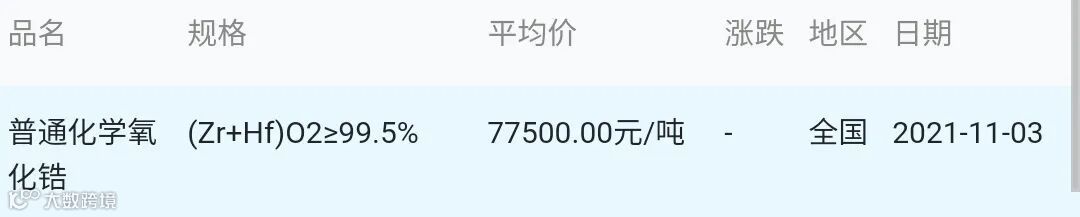 2021年11月03日氧化锆材料市场参考价: